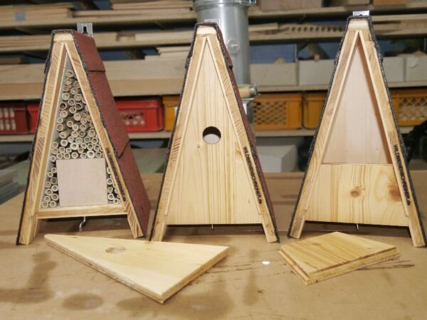 Alle Teile sind geschliffen und leicht gefast. An der Rückseite befindet sich eine stabile Metallöse zum aufhängen der Nisthilfe. Ein Anstrich mit Leinölgrundierfirnis schützt gegen Feuchtigkeit.