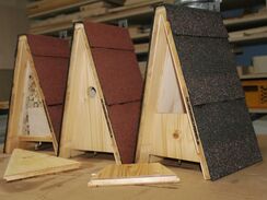Die Schutzdach besteht aus vollflächig verklebten, wetterfesten Bitumenschindeln und einem Bitumenfirst. Der Kasten selbst wurde aus witterungsbeständigen 16mm starken, rissfreien Dreischichtholzplatten (Fichte/Tanne) verschraubt und verleimt. Auf Gehrung gefräste, Einzelteile sowie die in Dach- und Bodeteile eingenutete Rückwand verleihen der Nisthilfe höchste Stabilität und Haltbarkeit.